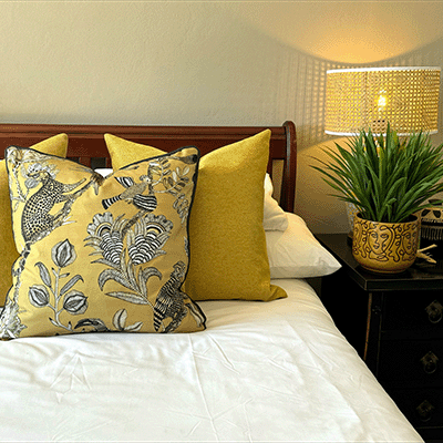 Ardmore fabric design ideal for in-house or patios. A plain upholstery yellow backside with dark grey piping to finish the scatter cover. 60cm x 60cm