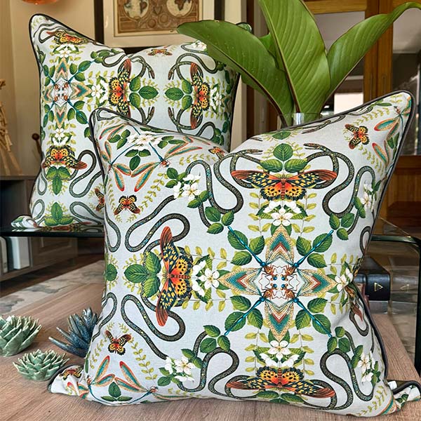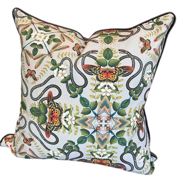 MoJo Scatter cover titled Papillion is create from 100% cotton fabric at the front and upholstery dark green at the back. 60cm x 60cm cover
