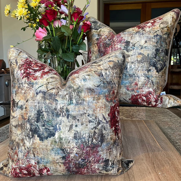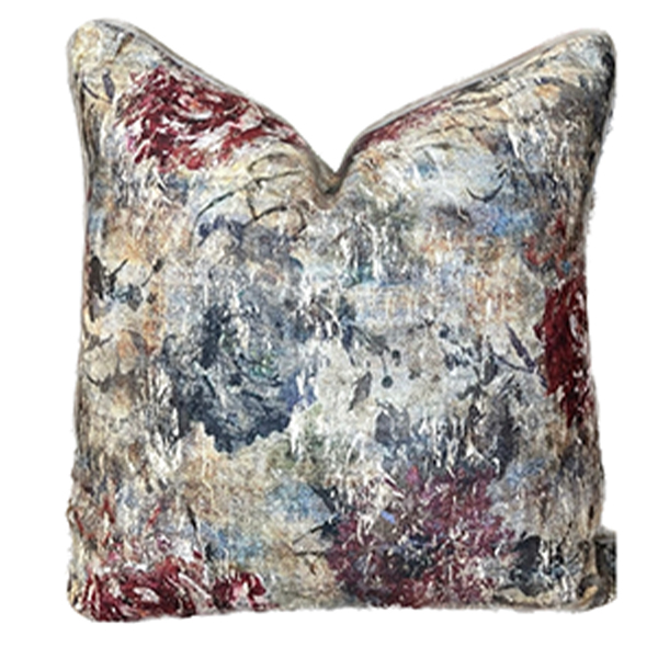 A irresistible upholstery velvet touch fabric with soft maroon and blue tones. 60cm x 60cm with consealed zip and piping finish.
